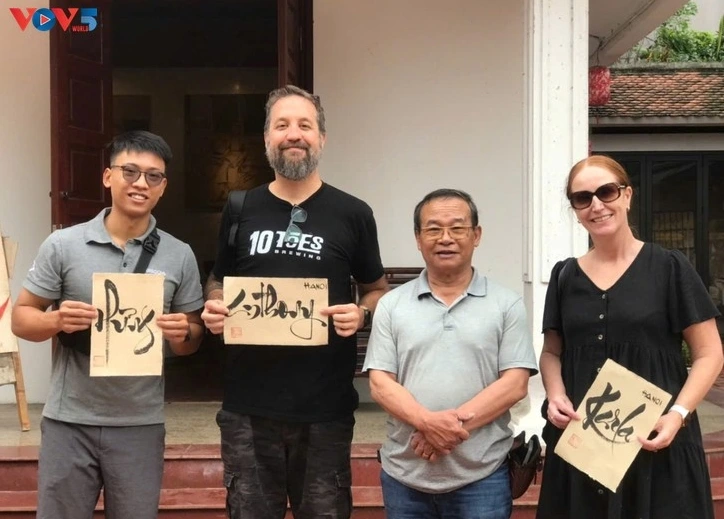 Tourists pose by their own calligraphy written on Do paper. (Photo: Kim Lieu)