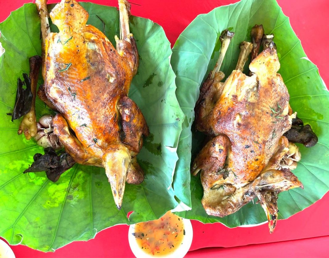 Local residents say that free-range chickens weighing between 1.3 and 1.8 kilograms are perfect for the recipe. After cleaning, the chicken is marinated with chúc leaves, coarse salt, garlic, lemongrass, chili, and sugar. Chúc leaves are considered the key ingredient of the dish, as they give the chicken its unique aroma and set ga dot O Thum apart from other grilled or roasted chicken dishes.