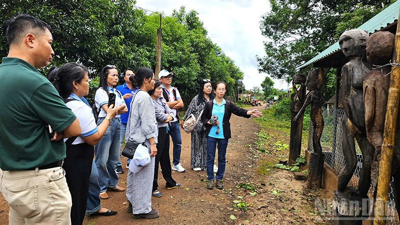 Du khách tham quan trải nghiệm, tìm hiểu về nhà mồ và tượng nhà mồ của đồng bào Jrai.