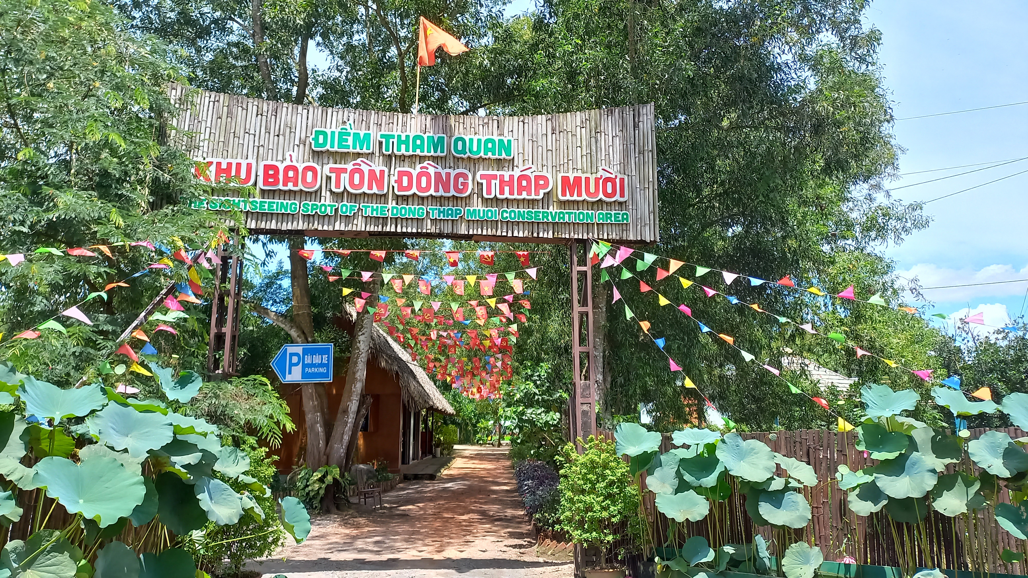 Ngay từ cổng vào, du khách đã cảm nhận được sự trong lành và gần gũi của vùng đất này. Cánh cổng tre giản dị mang dòng chữ “Điểm tham quan Khu bảo tồn Đồng Tháp Mười” mở ra một thế giới khác - nơi con người hòa cùng thiên nhiên trong một không gian tĩnh lặng mà sống động. Hai bên lối đi là những khóm sen xanh mướt, đung đưa trong gió, như những nàng thiếu nữ miền quê mộc mạc mà duyên dáng. Mùi hương sen thoang thoảng hòa quyện cùng hương tràm dìu dịu, mang đến cảm giác thư thái khó quên.