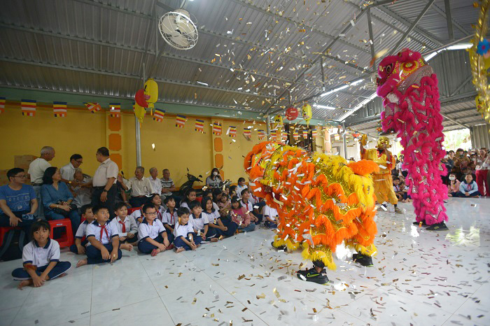 Ngay từ sáng sớm, khuôn viên chùa đã được trang hoàng lộng lẫy với hàng trăm chiếc lồng đèn ông sao, đèn cá chép, đèn kéo quân rực rỡ sắc màu - nhiều chiếc do chính tay các em nhỏ trong vùng tự làm. Tiếng trống múa lân rộn rã, tiếng reo hò vui sướng của trẻ thơ vang vọng khắp sân chùa, tạo nên bầu không khí náo nhiệt, hân hoan đặc trưng của đêm hội trăng rằm. Hàng trăm em học sinh địa phương háo hức tham gia các trò chơi dân gian, xem múa lân, nghe kể chuyện về chị Hằng - chú Cuội và cùng nhau rước đèn quanh sân chùa trong niềm hạnh phúc hồn nhiên.