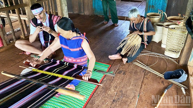 Du khách nước ngoài trải nghiệm du lịch cộng đồng người Jrai.