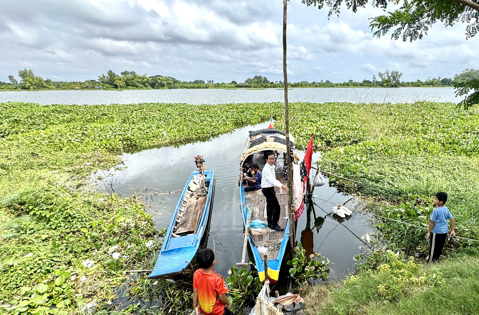 Trải nghiệm đầu tiên của chúng tôi ở búng Bình Thiên là ngồi ghe cùng ngư dân Chau Li, 58 tuổi, đồng bào Chăm, cả đời gắn chặt với nghề giăng lưới. Ghe gỗ nhỏ, chòng chành giữa lớp lục bình ven bờ. Ông Chau Li vừa điều khiển vừa kể: “Vợ chồng tôi không ruộng rẫy, bám búng nuôi 5 đứa con. Mỗi ngày kiếm vài ký cá, đủ sống, miễn tụi nhỏ còn được đi học”. Giọng ông chậm rãi, hiền như nước. Tôi nghe trong đó cả gió bấc của mùa nước ròng và hơi ấm của những phận người bám bờ lặng lẽ.