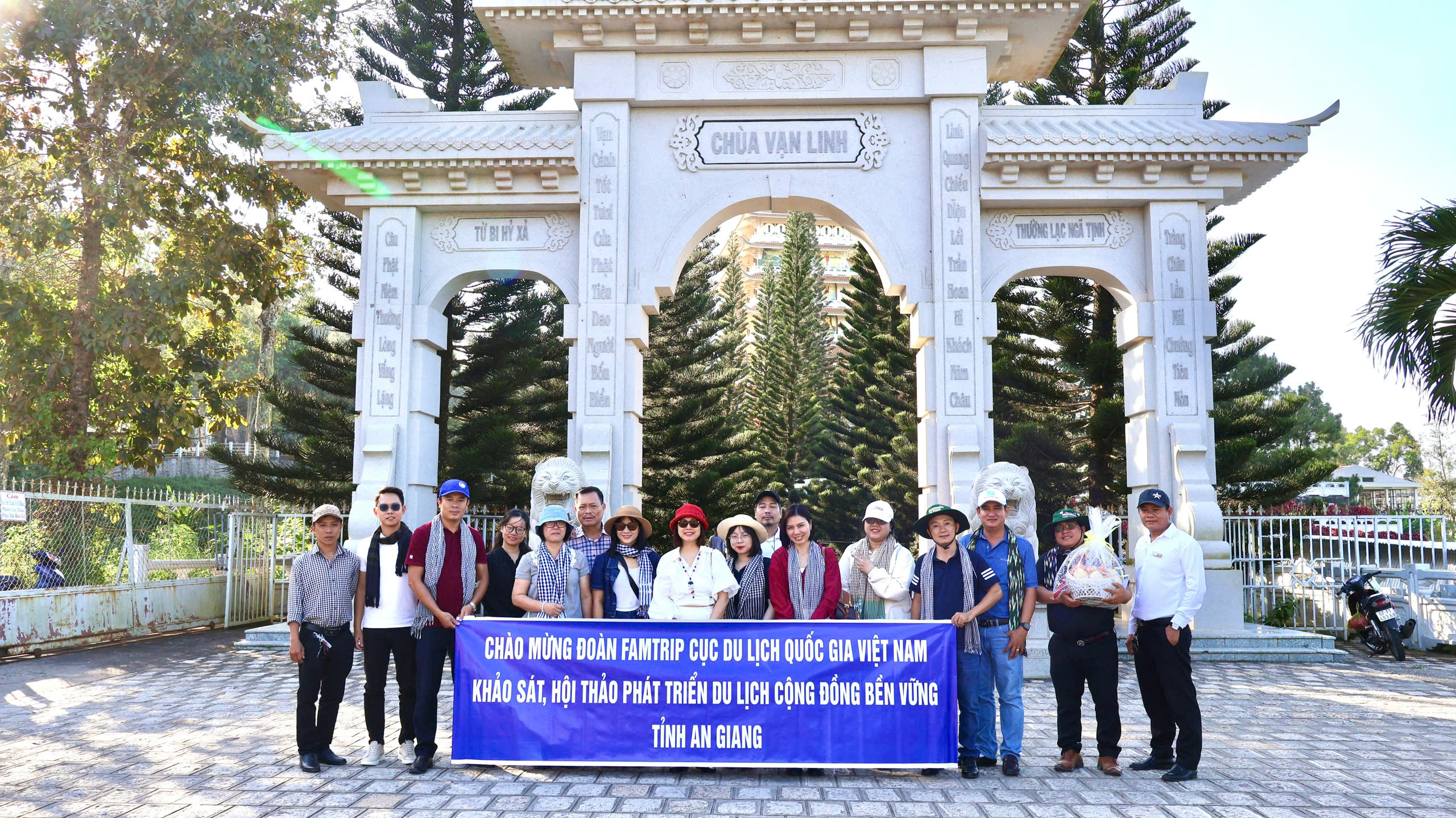 Đoàn khảo sát tại chùa Vạn Linh, núi Cấm. Ảnh: TITC