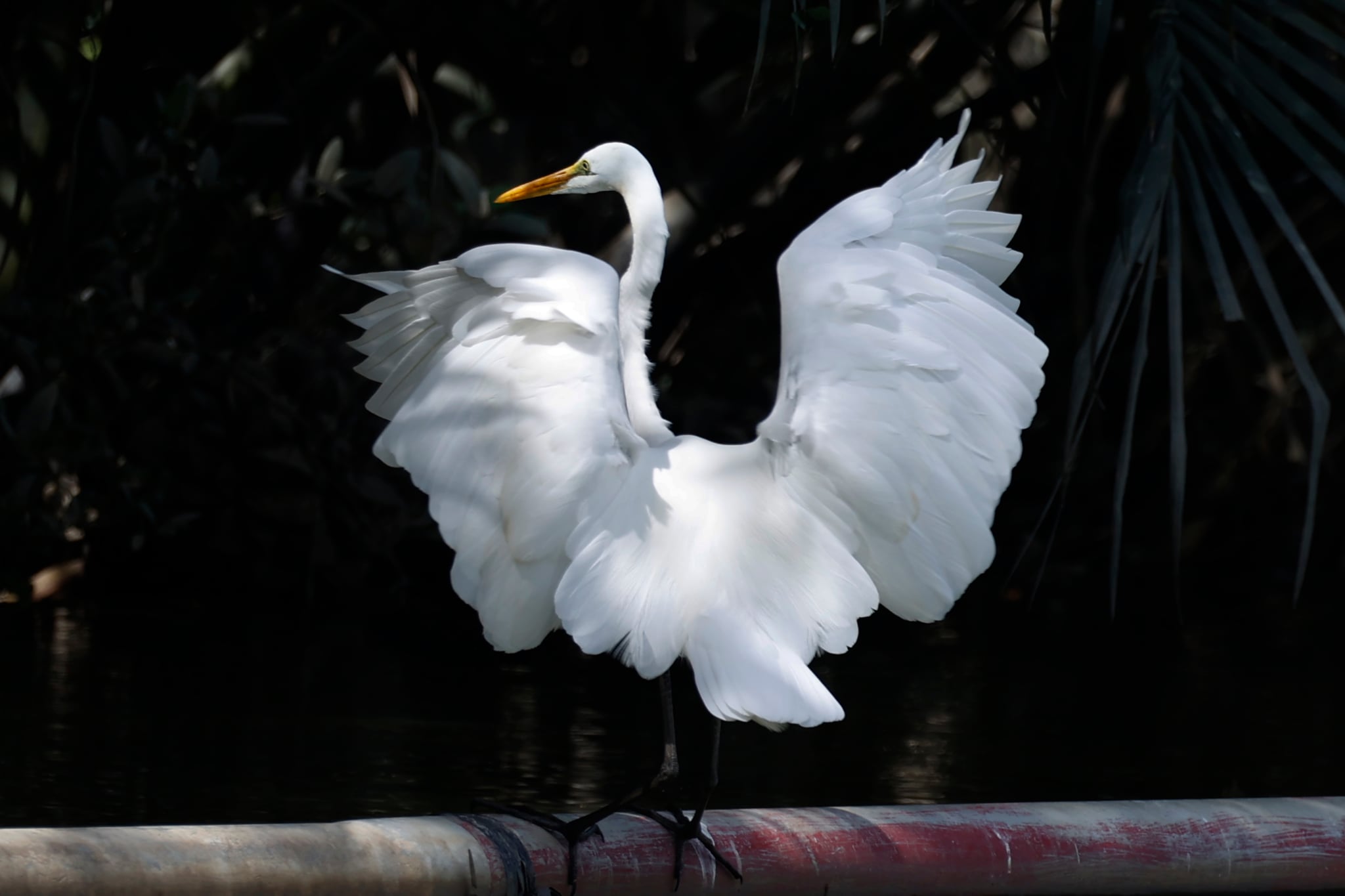 Khoảnh khắc ấn tượng nhất chính là lúc một chú cò đơn độc xoè cánh, giữ thăng bằng trên một thân cây mục hoặc một đoạn tre như trong bức ảnh. Đôi cánh xoè rộng, cong nhẹ ở mép, từng lớp lông xếp gọn và mềm như mây khiến nó trông chẳng khác gì một vũ công đang thực hiện động tác mở màn. Cổ cò vươn thanh mảnh, chiếc mỏ vàng điểm một nét sắc lạnh, tất cả hoà lại thành tư thế uyển chuyển đến mức tưởng như đã được dàn dựng tỉ mỉ.
