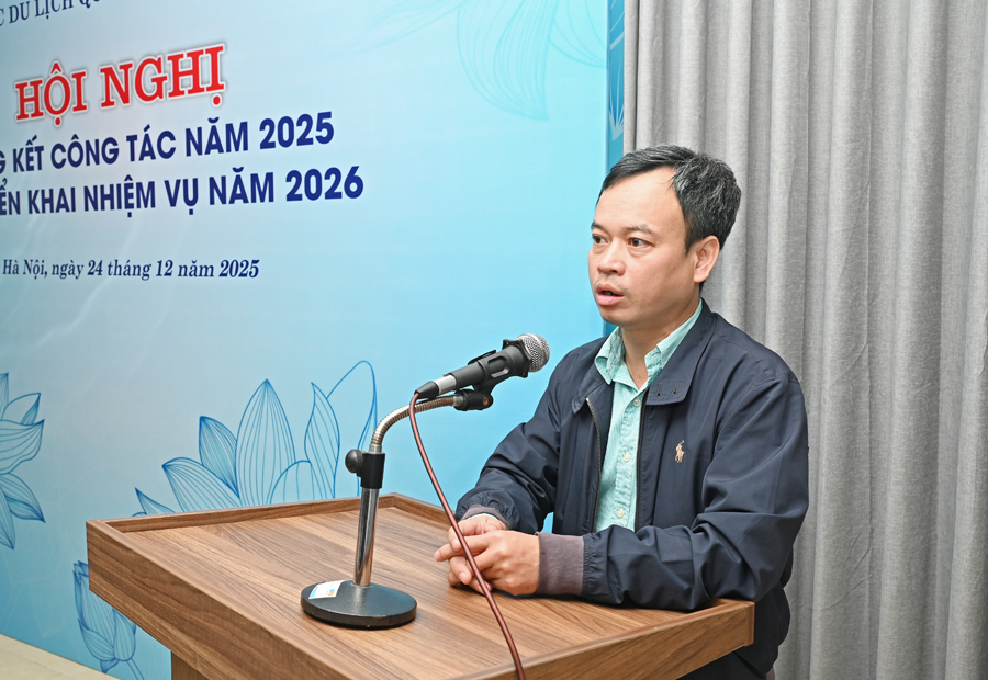 Tại Hội nghị, Phó Cục trưởng Cục Du lịch Quốc gia Việt Nam Hà Văn Siêu đã trình bày Báo cáo tổng kết công tác năm 2025 và triển khai các nhiệm vụ trọng tâm năm 2026. Theo đó, bám sát phương châm hành động năm 2025 “Kỷ cương - Nêu gương - Trách nhiệm - Tinh gọn - Hiệu quả - Về đích” và tinh thần “3 Quyết tâm, 4 Chủ động, 5 Hiệu quả”, Cục Du lịch Quốc gia Việt Nam đã chủ động tham mưu và triển khai đồng bộ nhiều giải pháp quan trọng, tạo chuyển biến rõ nét trong quản lý nhà nước, xúc tiến quảng bá, phát triển sản phẩm và thị trường du lịch.