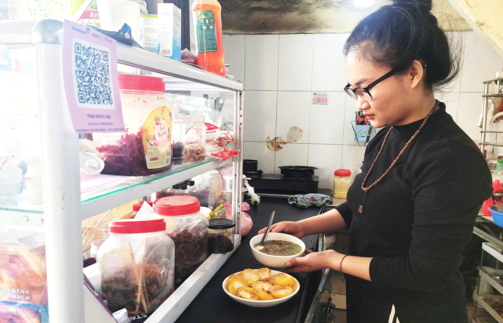 Chị Trần Ngọc Mai chuẩn bị các phần cháo chờ để phục vụ khách.
