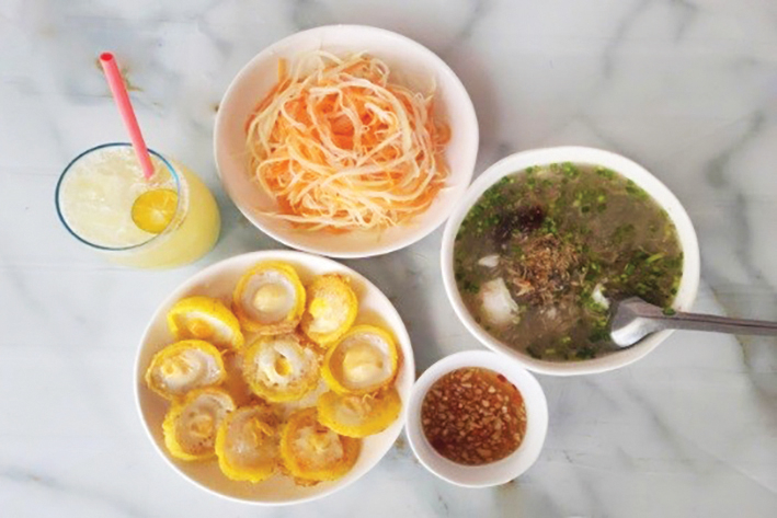 “Cháo chờ” thường được ăn kèm với bánh khọt, nộm, bánh quẩy.