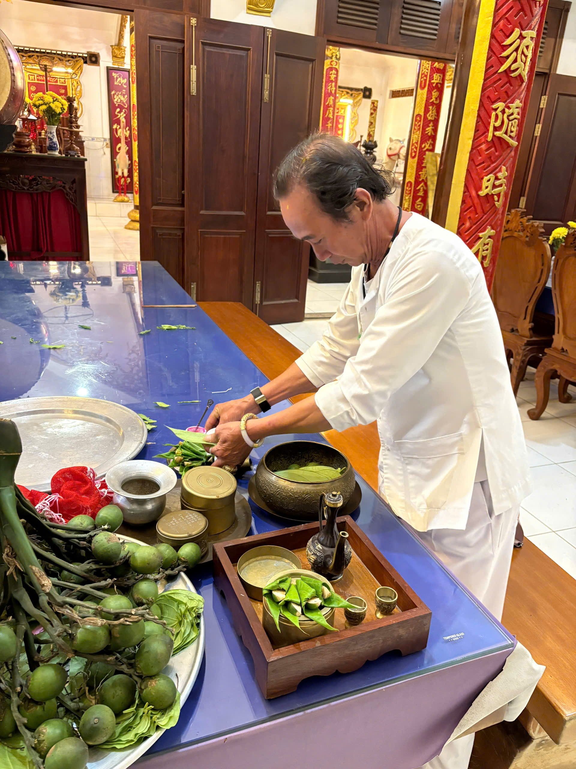 Ông Nguyễn Hữu Tiến - Phó trưởng ban quý tế Đình thần Bình Nhan têm trầu mời khách. Ảnh: TITC